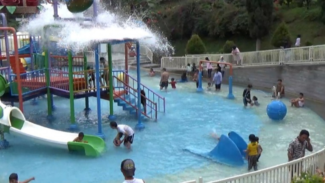 Batu,Jawa Timur - Hari pertama pemberlakuan anak di bawah umur boleh masuk tempat wisata setelah level PPKM diturunkan, kolam renang taman rekreasi Selecta di Batu, Jawa Timur diserbu pengunjung terutama anak-anak.