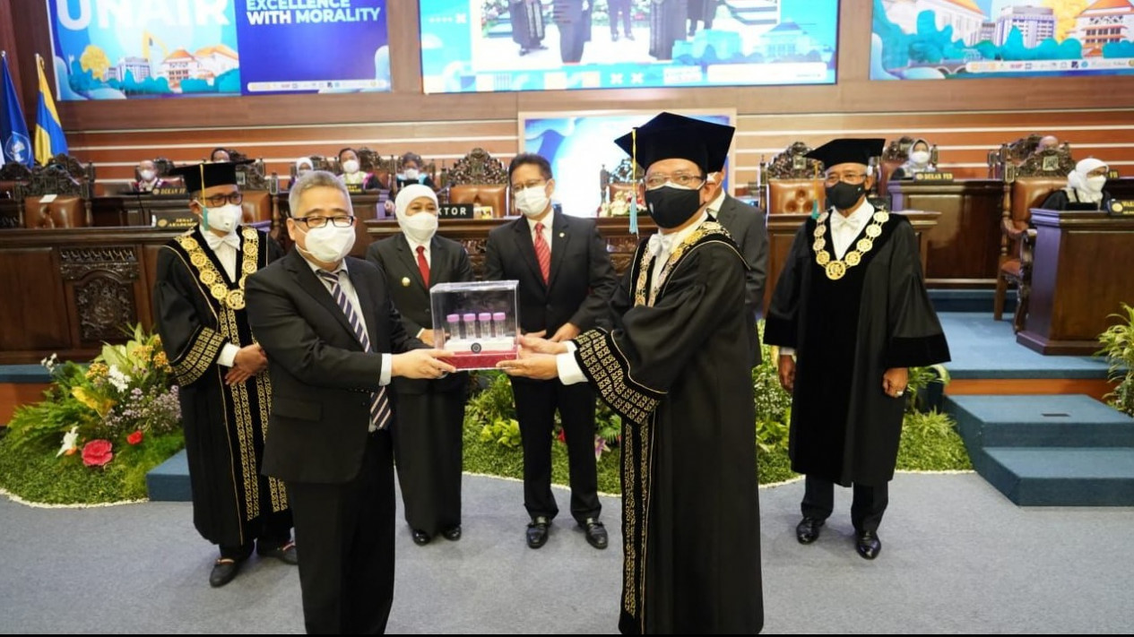 Rektor Unair menyerahkan bibit Vaksin Merah Putih kepada PT. Biotis Pharmaceutical. PT Biotis adalah salah satu mitra untuk memproduksi vaksin Merah Putih.