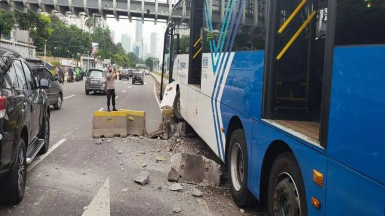 Jakarta - Bus TransJakarta kembali mengalami kecelakaan, kali ini berlangsung di depan Ratu Plaza, Jalan Sudirman, Jakarta, Jumat (3/12/2021). Bus tersebut menghantam separator sehingga beton pecah dan badan bus ringsek di bagian kiri depan.