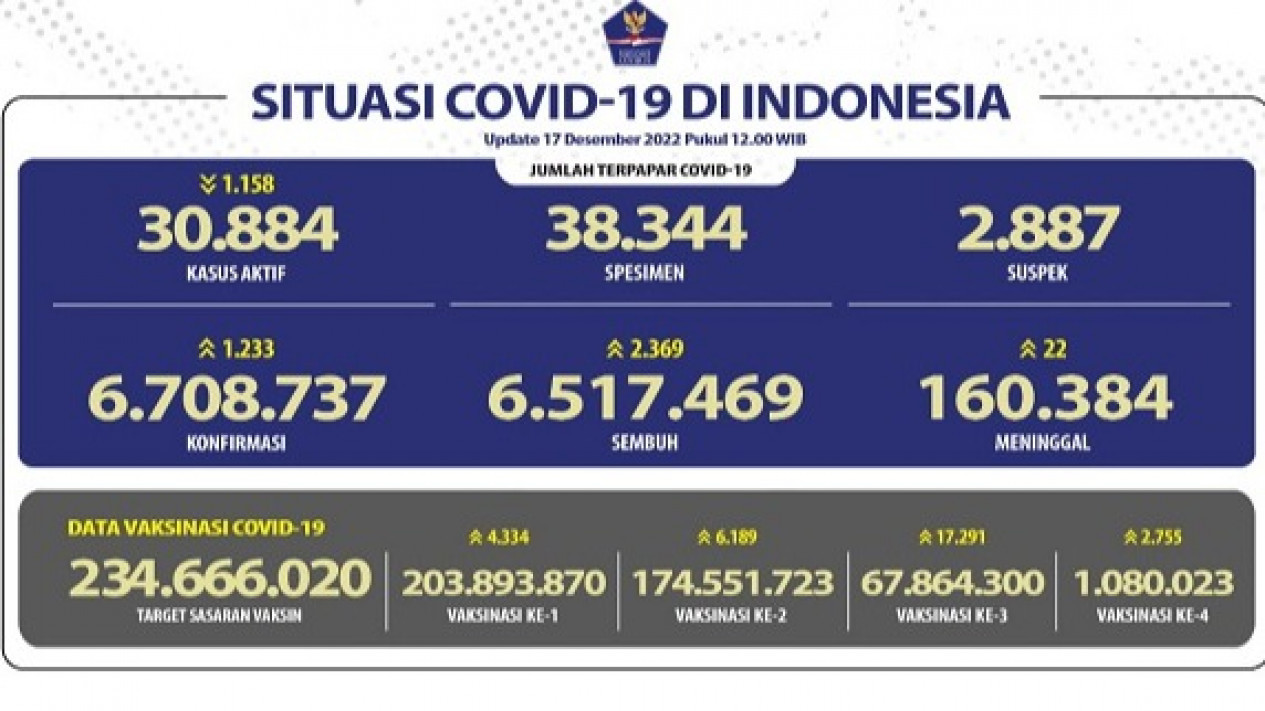 Jakarta - Satuan Tugas (Satgas) Covid-19 melaporkan bahwa total kasus per hari Sabtu (17/12/2022) bertambah 1.233, dengan DKI Jakarta penyumbang terbanyak yakni 394.