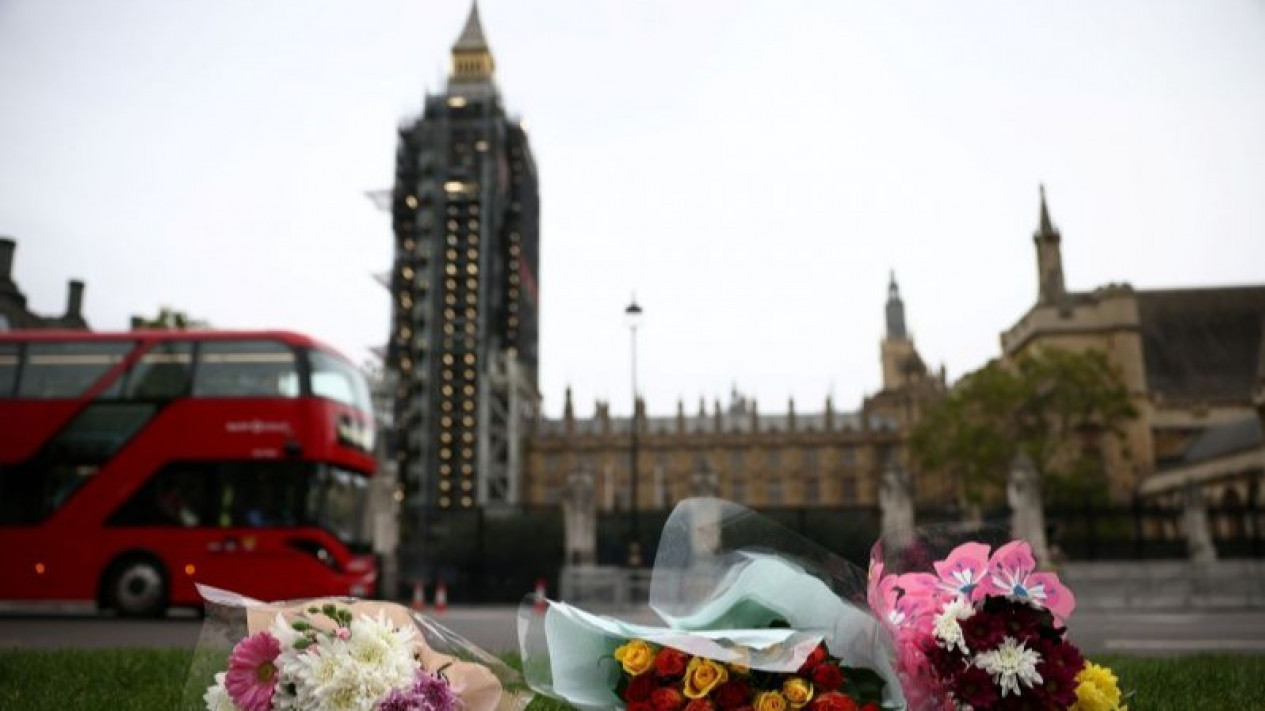 Bunga penghormatan diletakkan di depan Gedung Parlemen di London, Inggris, Sabtu (16/10/2021),.