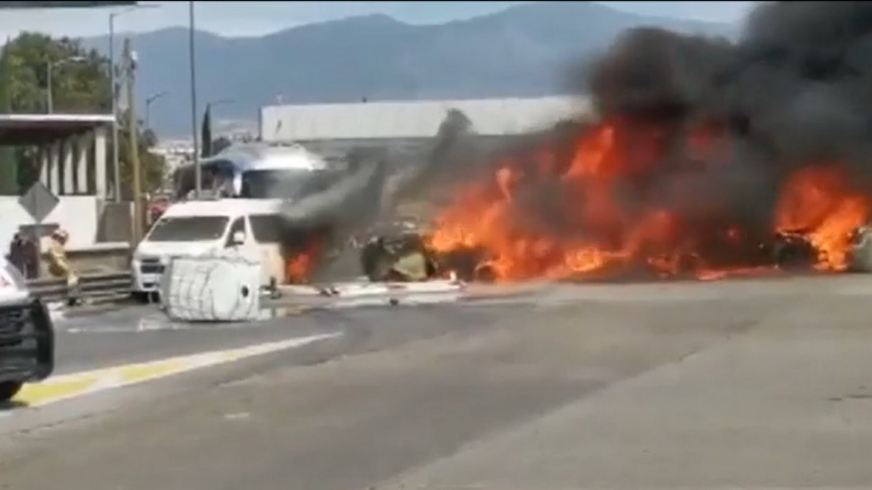 Dalam gambar yang dirilis oleh pasukan keamanan nasional Meksiko, terlihat sejumlah kendaraan terbakar akibat kecelakaan.