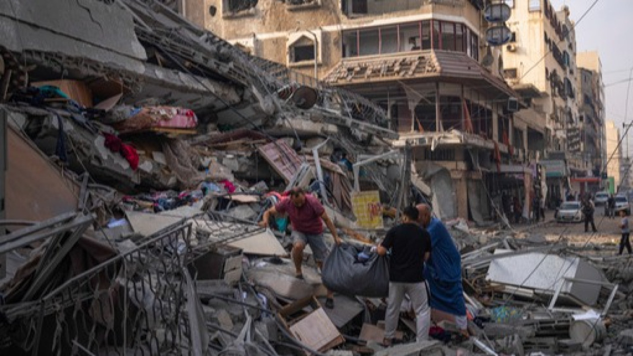 Warga Palestina menjelajahi puing-puing bangunan setelah terkena serangan udara Israel, di Kota Gaza, Minggu, 8 Oktober 2023.