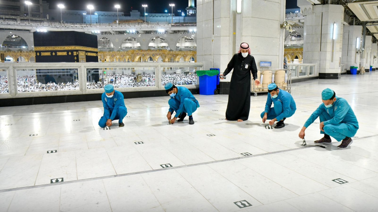 Sejumlah perubahan pun telah disesuaikan, seperti para petugas di Masjidil Haram yang telah menyingkirkan tanda-tanda social distancing.