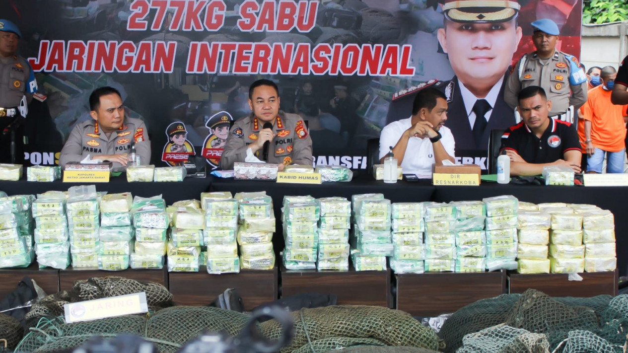 “Pagi ini saya berikan apresiasi setinggi-tingginya dan semangat atas kinerja yang ditorehkan oleh Satnarkoba Polres Metro Jakarta Barat dengan total barbuk jenis sabu seberat 277 kg,” jelas Kapolda Metro Jaya Fadil Imran dalam jumpa pers, Kamis (23/2/2023).