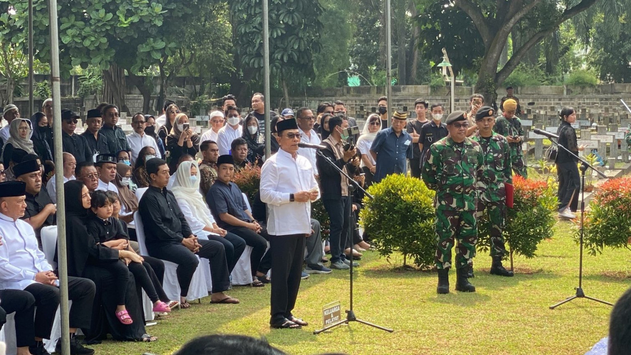 Banten, tvOnenews.com - Kepala Staf Kepresidenan (KSP) RI, TNI (purn) Moeldoko memberi sambutan usai sang istri Koesni Warningsih dikebumikan, di Taman Makam Pahlawan Bahagia, Tangerang Selatan, Banten, Minggu (12/3/2023).