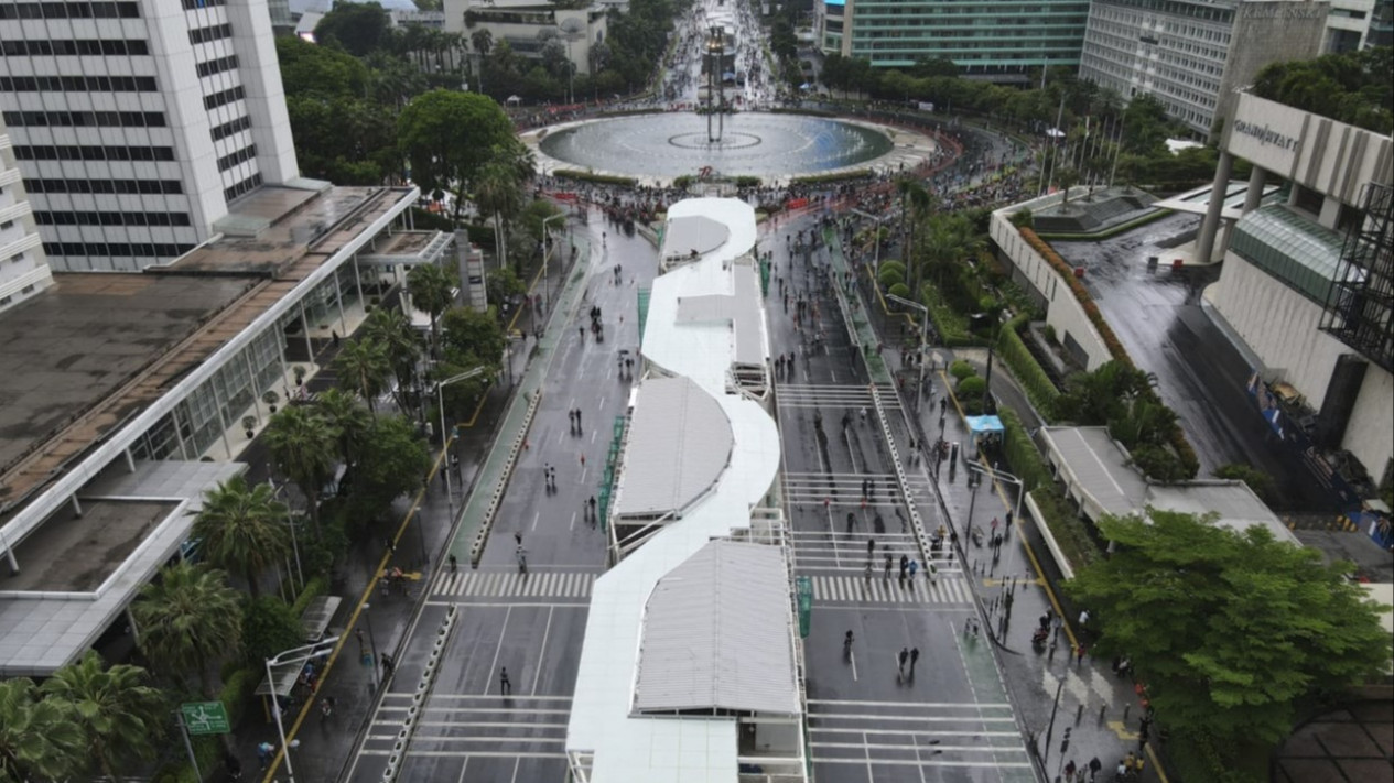 Halte TransJakarta ikonik ini dilengkapi dengan sky deck view untuk warga berswafoto dengan latar belakang Patung Selamat Datang dan gedung pencakar langit di kawasan Bundaran HI. (agr/ree)