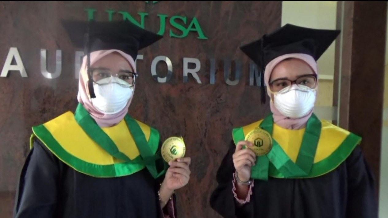 Surabaya, Jawa Timur - Perayaan wisuda di kampus Universitas Nahdhatul Ulama Surabaya (Unusa), berbeda dengan tahun sebelumnya. Selain menerapkan protokol kesehatan ketat karena masih dalam suasana pandemi Covid-19, di wisuda kali ini, terdapat mahasiswi kembar identik dari Fakultas Kedokteran, yang diwisuda bersamaan.