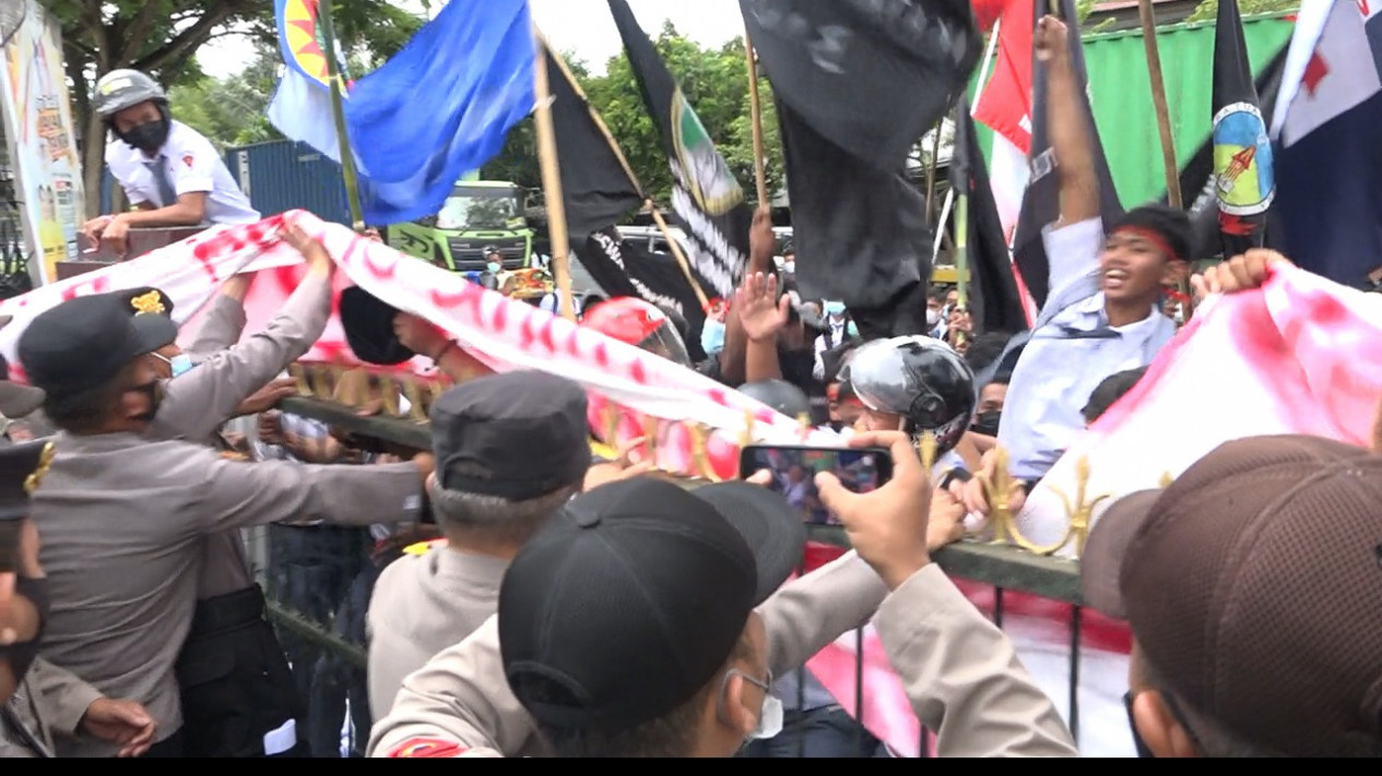 Aksi saling dorong terjadi antara massa pengunjuk rasa yang terdiri dari pelajar dan mahasiswa dengan aparat kepolisian di depan PN Makale, Tana Toraja, Selasa.