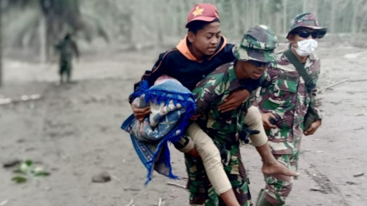 Prajurit TNI AU membopong seorang warga yang menjadi korban letusan Gunung Semeru.