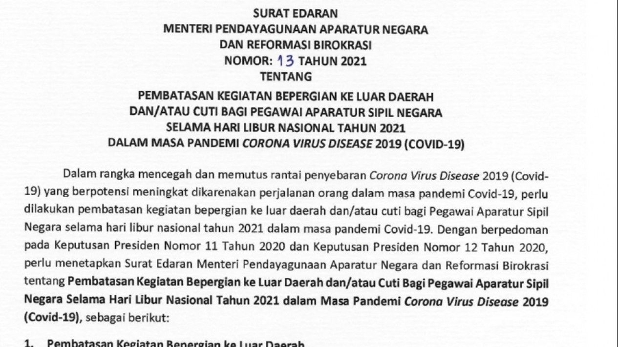 Jakarta - Aparatur Sipil Negara (ASN) tak lagi bebas bepergian ke luar daerah selama libur nasional tahun 2021. Pasalnya, Menteri Pendayagunaan Aparatur Negara dan Reformasi Birokrasi (PANRB) telah menerbitkan Surat Edaran Menteri PANRB Nomor 13 Tahun 2021 tentang Pembatasan Kegiatan Bepergian ke Luar Daerah dan/atau Cuti bagi Pegawai ASN Selama Hari Libur Nasional Tahun 2021 dalam Masa Pandemi Covid-19.