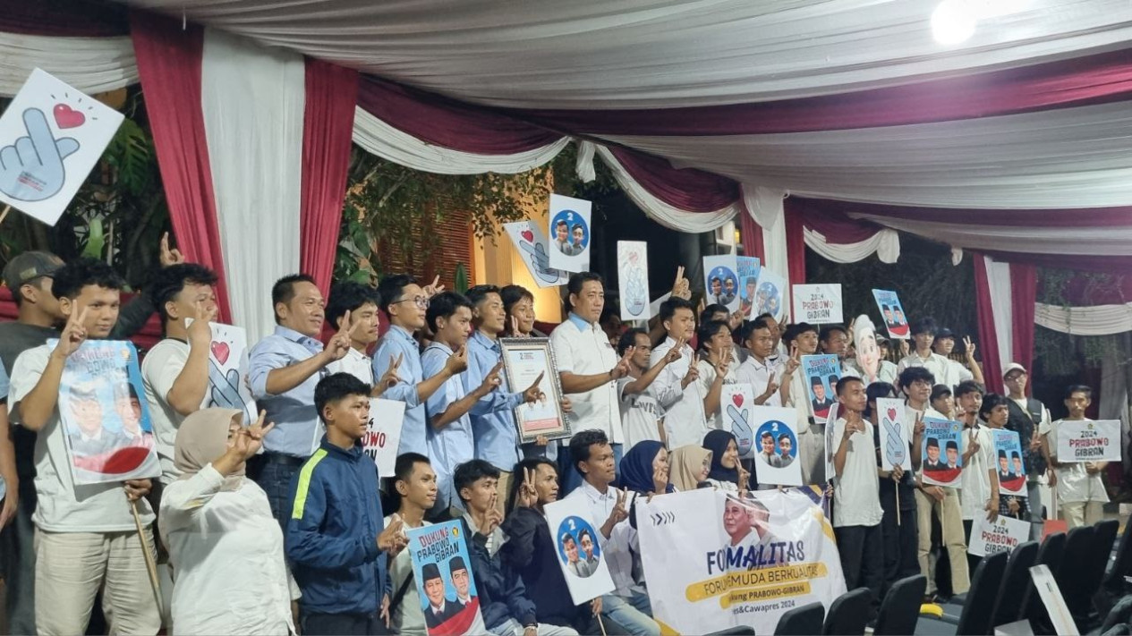 "Pada malam ini kita terima dukungan dari temen-temen Forum Pemuda Berkualitas yaitu Formalitas dari Bogor Barat. Mereka mendukung untuk kemenangan Prabowo-Gibran," kata Azanil.