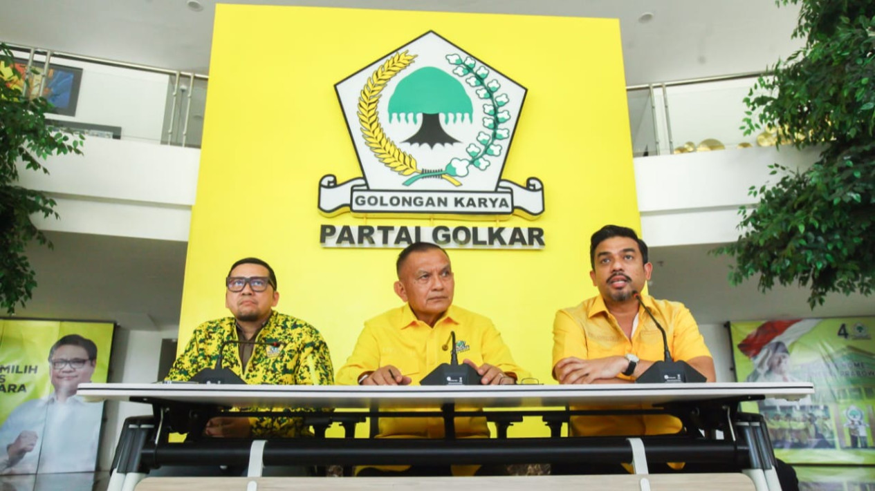 Sekjen Partai Golkar Lodewijk Freidrich Paulus didampingi Wakil Ketua Umum Ahmad Doli Kurnia dan Ketua Bappilu Maman Abdurrahman mengaku bersyukur atas pencapaian pada pilpres dan pileg dalam Pemilu 2024.