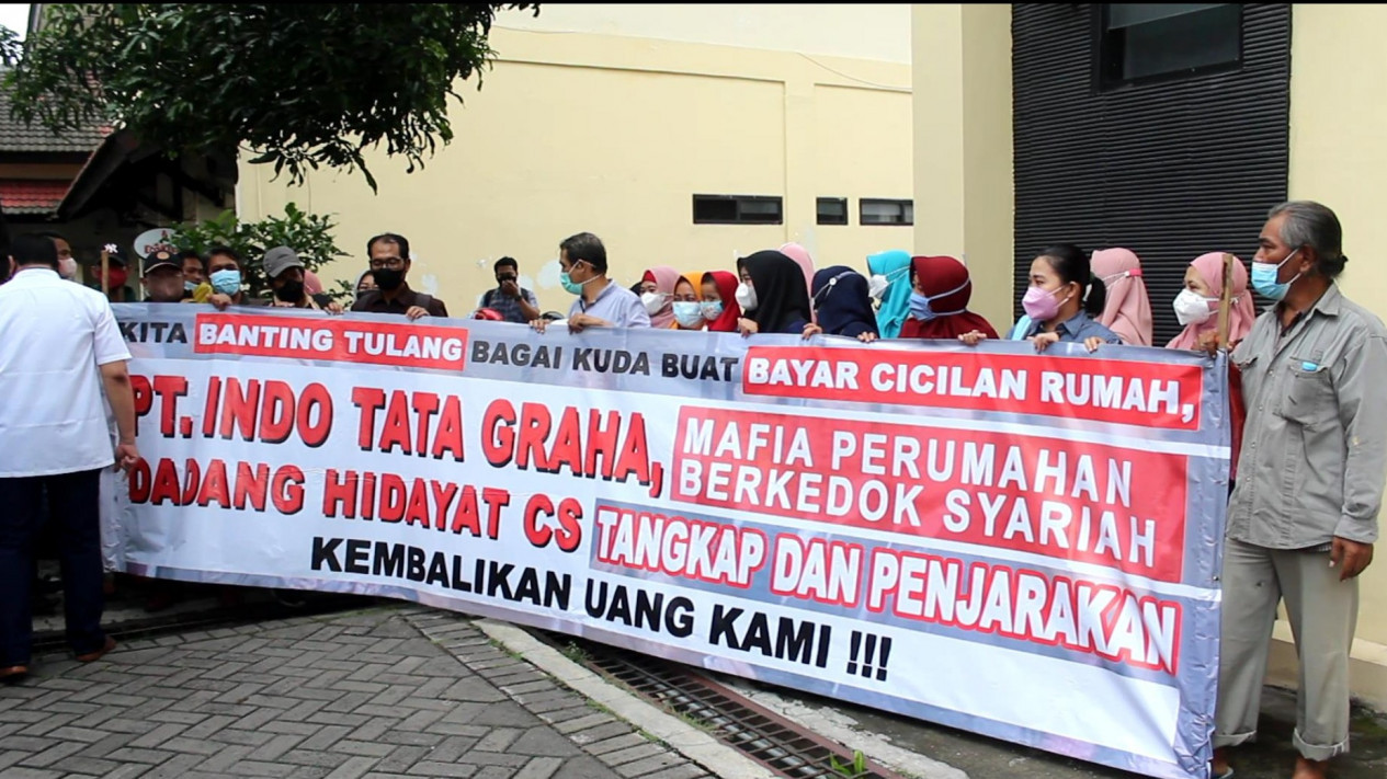 Surabaya, Jawa Timur - Tertipu pembelian perumahan berkedok syariah, sedikitnya 25 orang didampingi kuasa hukum, mendatangi Sentra Pelayanan Kepolisian Terpadu (SPKT) Polda Jatim, untuk melaporkan manajemen pengembang perumahan PT Indo Tata Graha. Mereka melaporkan pembelian atas tiga lokasi perumahan fiktif, yakni dua di perumahan kawasan Sidoarjo, dan satu perumahan di kawasan Pasuruan.