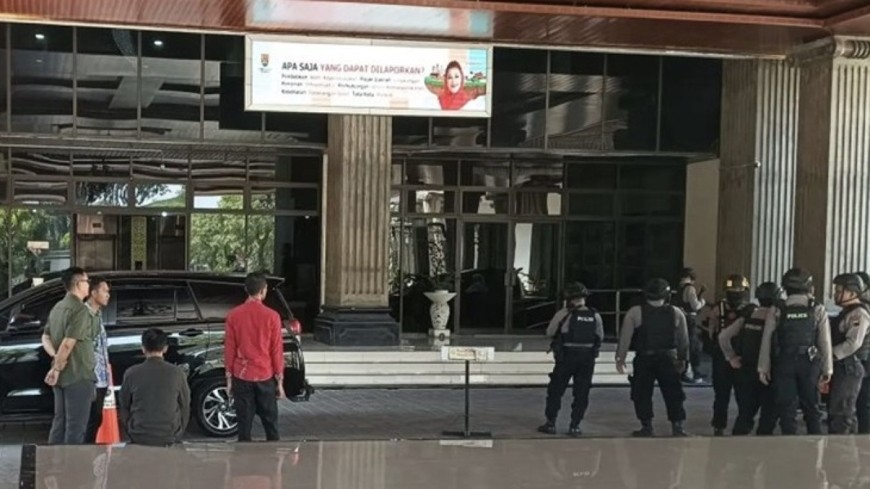 Aparat kepolisian bersenjata laras panjang tampak datang bersama rombongan penyidik dan berjaga di selasar Balai Kota Semarang.