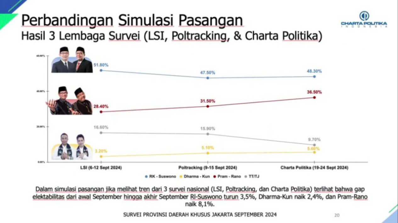 "Dalam simulasi pasangan jika melihat tren dari 3 survei nasional (LSI, Poltracking dan Charta Politika) terlihat bahwa elektabilitas dari awal september hingga akhir september RK-Suswono turun 3.5%, Dharma-Kun naik 2.4%, dan Pram - Doel naik 8.1%” Ujar Yunarto Wijaya (3/10/24)