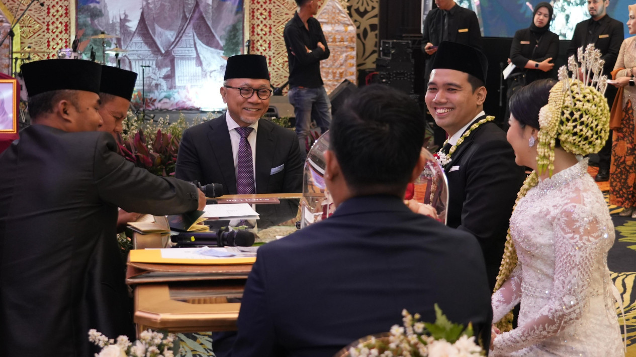 Jakarta, tvOnenews.com - Menteri Koordinator Bidang Pangan Zulkifli Hasan (Zulhas) menjadi saksi pernikahan Frans Faisal dengan Indah Tri Pertiwi. Adapun akad nikah Frans faisal dan Indah berlangsung di Grand Slipi Tower, Jakarta Barat, hari ini.