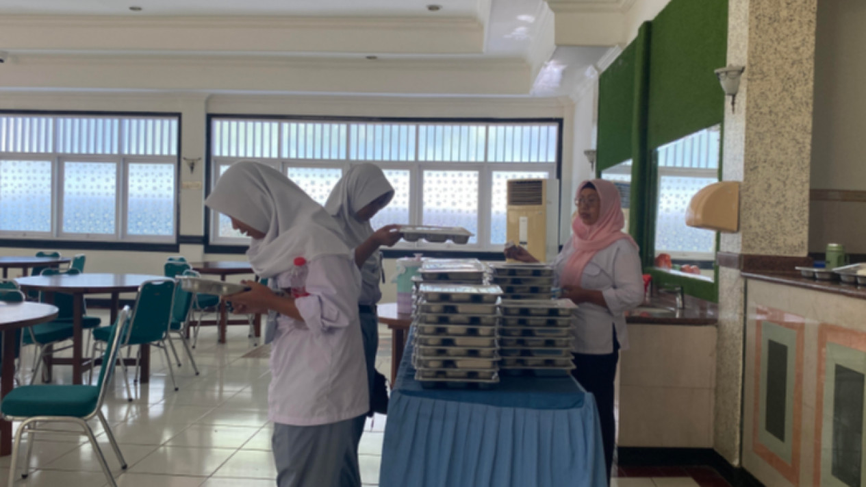 Sementara, dua petugas sudah berjaga di tempat pengambilan makanan. Meskipun dengan sistem catering, tempat makan yang digunakan sama seperti program MBG, yakni ompreng.