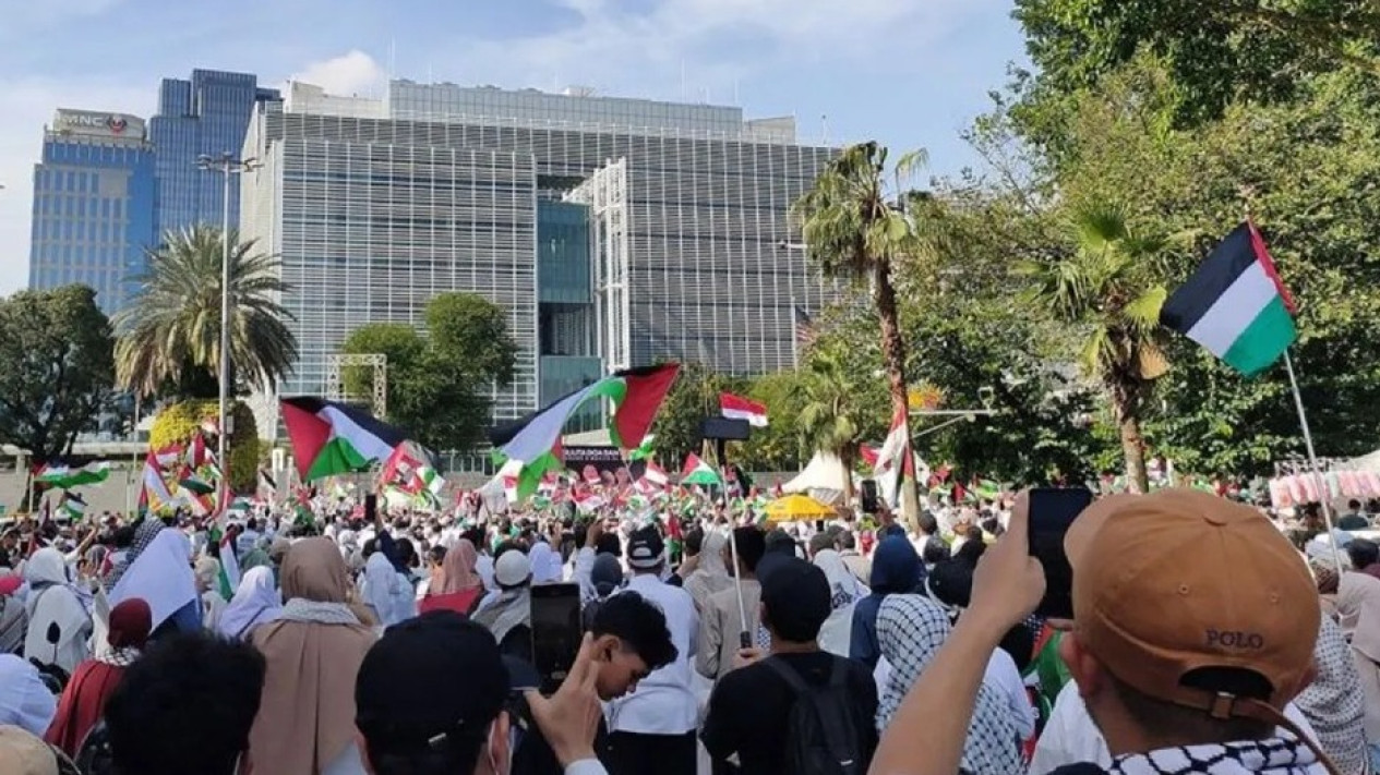 Mayoritas peserta mengenakan gamis putih sambil membawa atribut bernuansa Indonesia dan Palestina. Di sekitar lokasi, bendera Palestina juga tampak berkibar di antara lautan massa.