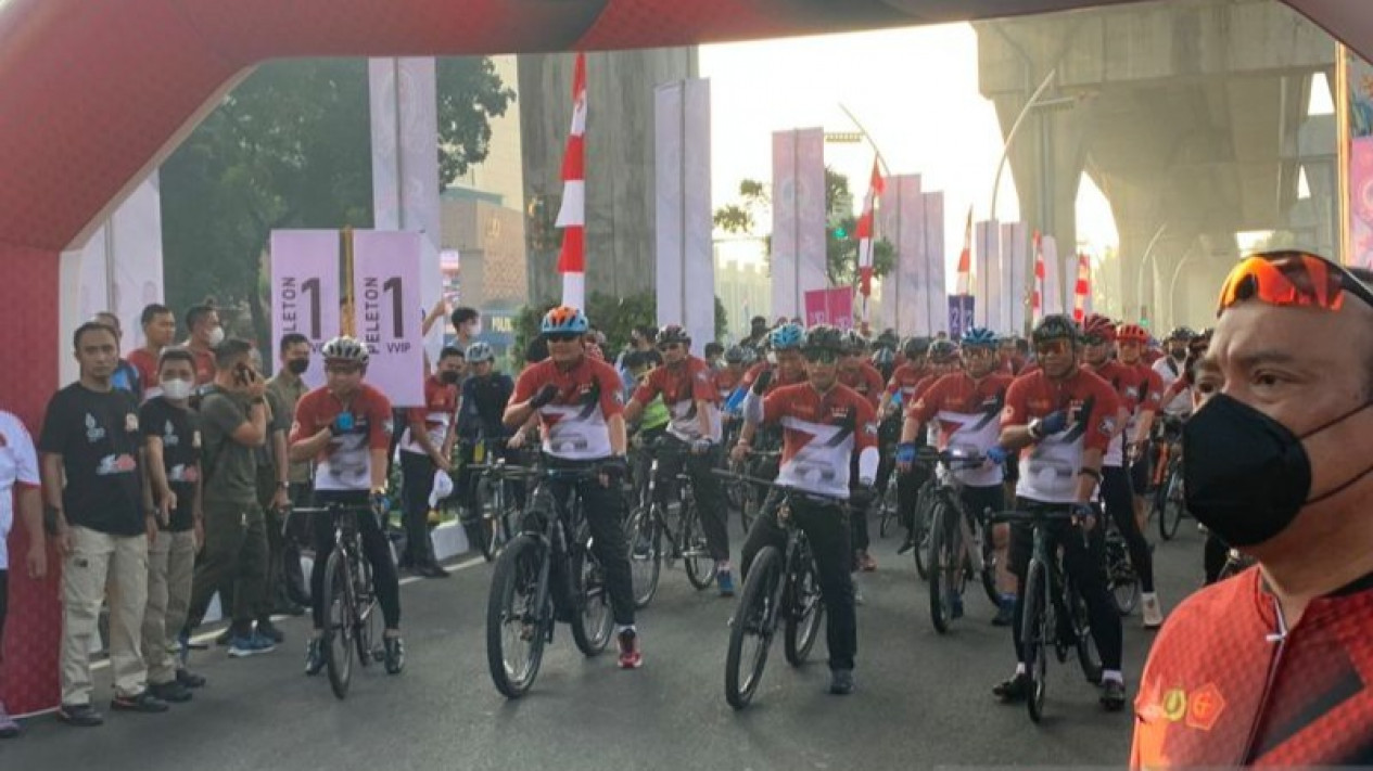 Jakarta - Peringati HUT Ke-76 Bhayangkara Mabes polri menggelar acara Fun Bike pada Minggu (19/6/2022). Kegiatan fun bike atau sepeda santai diikuti 33.170 peserta yang terdiri atas unsur Polri, TNI, media, mahasiswa, organisasi kemasyarakatan dan pemuda (OKP) dan masyarakat umum.