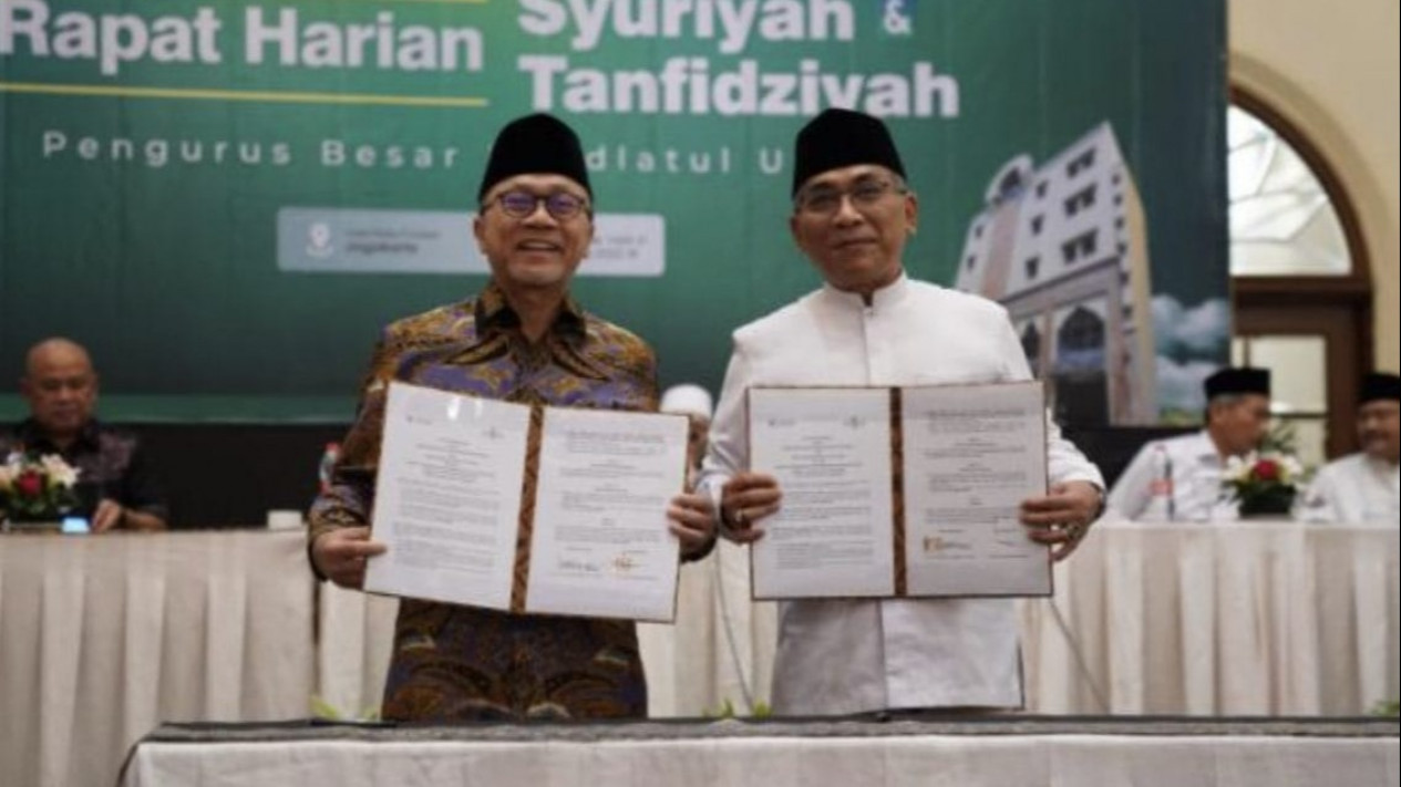 Menteri Perdagangan Zulkifli Hasan bersama Ketua Umum PBNU Yahya Cholil Staquf menandatangani nota kesepahaman antara Kementerian Perdagangan dan PBNU.