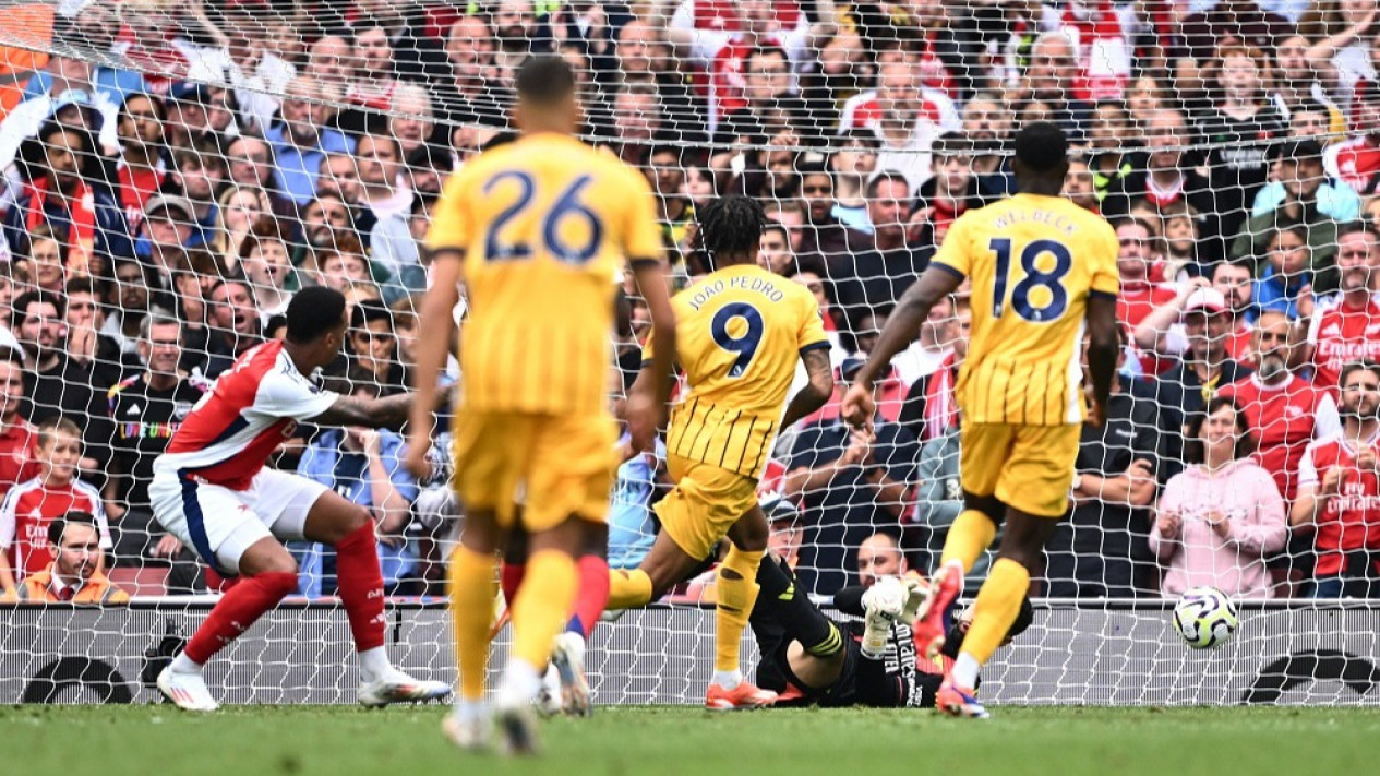 Tampil di kandang sendiri, The Gunners telah berusaha mendominasi permainan sedari awal dengan Bukayo Saka dan Leandro Trossard meneror pertahanan The Seagulls.