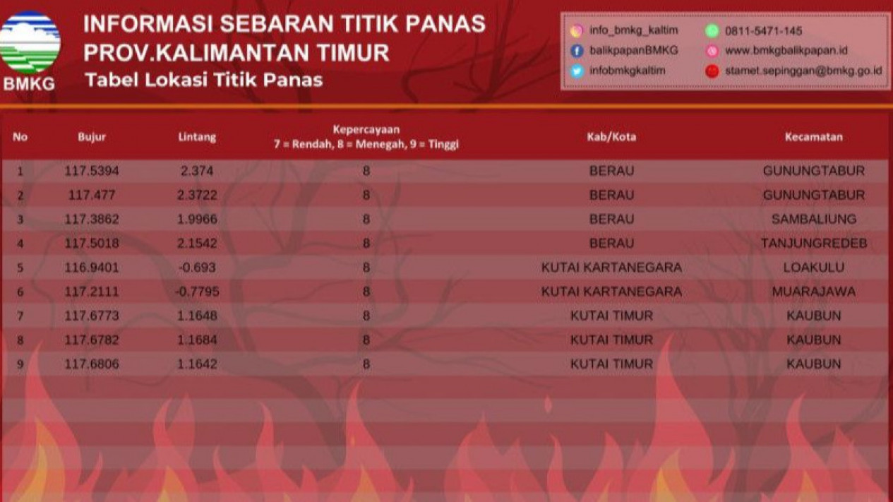 Badan Meteorologi, Klimatologi, dan Geofisika (BMKG) melalui stasiun di Kota Balikpapan, mendeteksi adanya sembilan "hotspot" (titik panas) yang tersebar pada tiga kabupaten di Provinsi Kalimantan Timur.