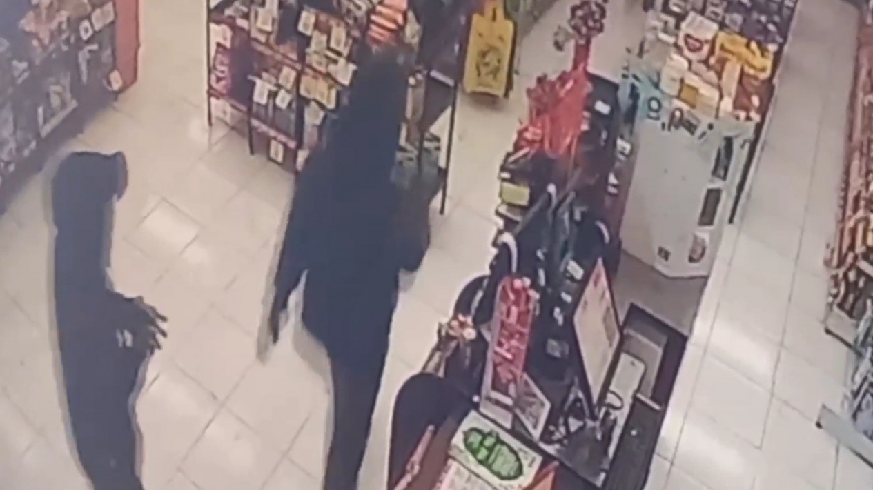 Dalam rekaman video pengawas tersebut, terlihat seorang karyawan toko swalayan yang  sedang membereskan barang di toko tiba-tiba dihampiri seorang pelaku yang mengancamnya dengan menggunakan senjata tajam.