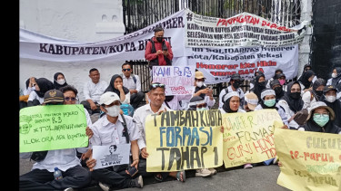Bandung, tvOnenews.com - Ratusan guru dan tenaga pendidikan honorer dari berbagai daerah di Jawa Barat melakukan aksi ujuk rasa di depan Gedung DPRD Jawa Barat, Senin (13/01/2025). Mereka menuntut diangkat segera menjadi pegawai pemerintah dengan perjanjian kerja (PPPK).