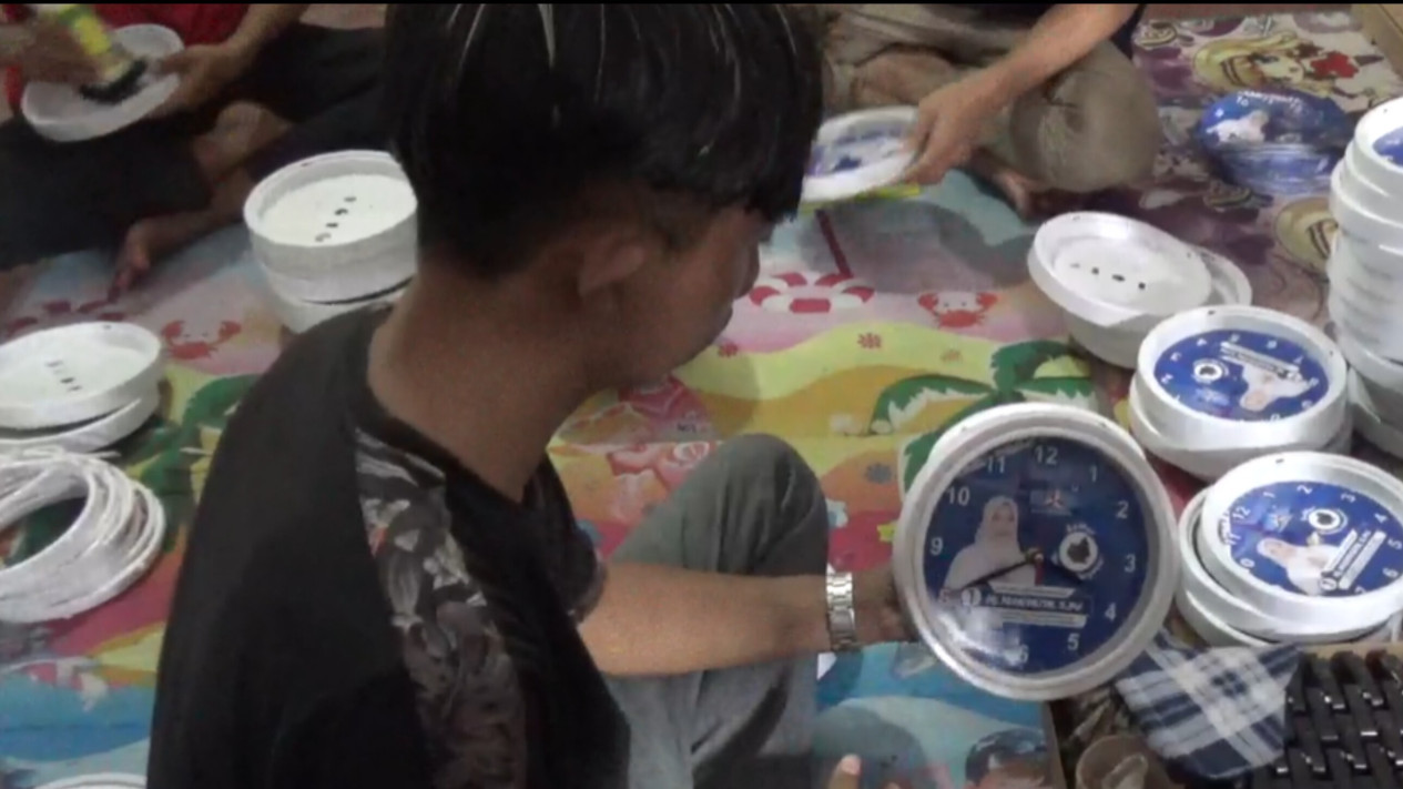Pemalang, tvOnenews.com - Menjelang datangnya masa kampanye pemilu 2024, para calon legislatif (caleg) dari berbagai Partai Politik mulai memburu buah tangan atau souvernir untuk kampanye. Salah satu souvernir yang diburu adalah jam dinding bergambar caleg.
