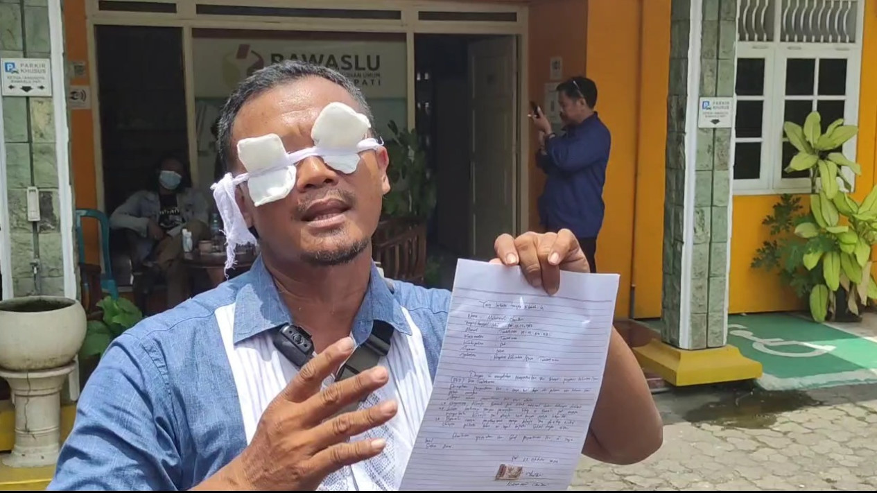 Dalam aksinya di depan kantor Bawaslu Pati, Muhammad Chudori, menutup matanya sambil membawa surat pengunduran diri bermaterai saat menyerahkannya kepada ketua Bawaslu Kabupaten Pati.