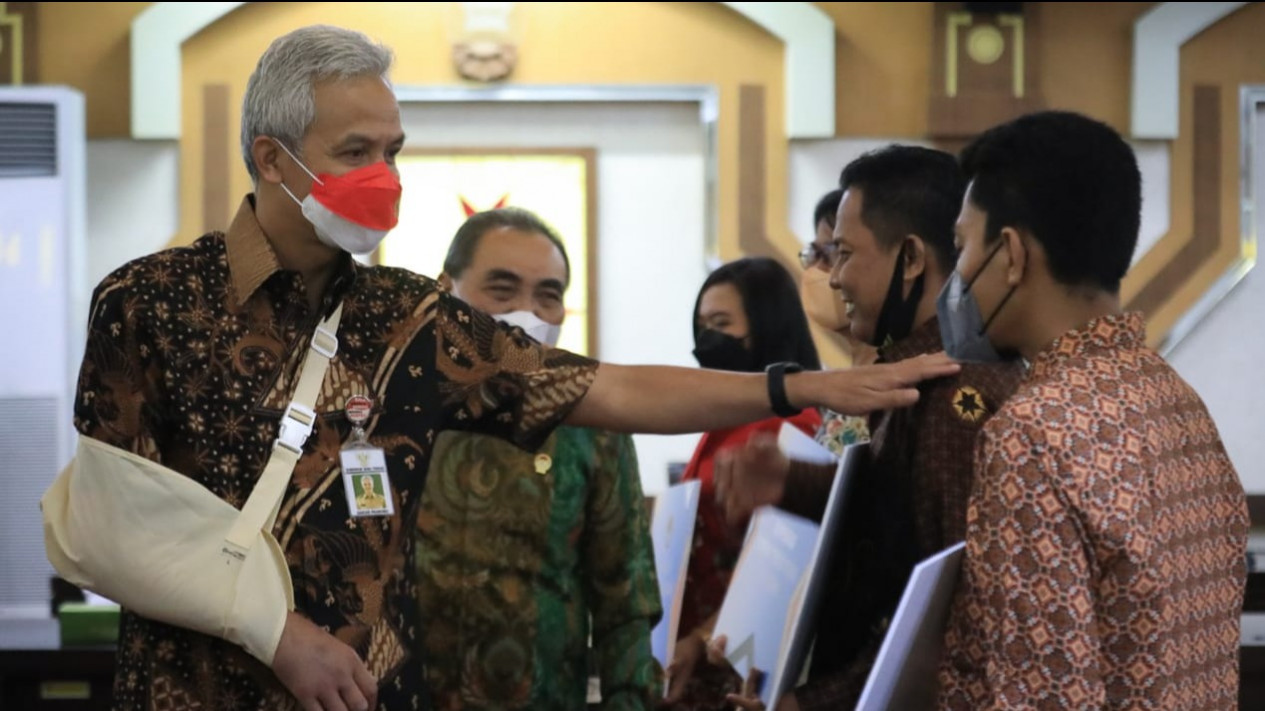 Semarang, Jawa Tengah - Ada yang beda dari penampilan Gubernur Jawa Tengah Ganjar Pranowo hari ini, Rabu (9/2/2022). Ia Sabtu lalu jatuh saat bersepeda dan harus menjalani operasi tulang tangan kanan. Dan pada Senin kemarin ia keluar rumah sakit dengan tangan dibebat, tapi terlihat seperti biasa saja.