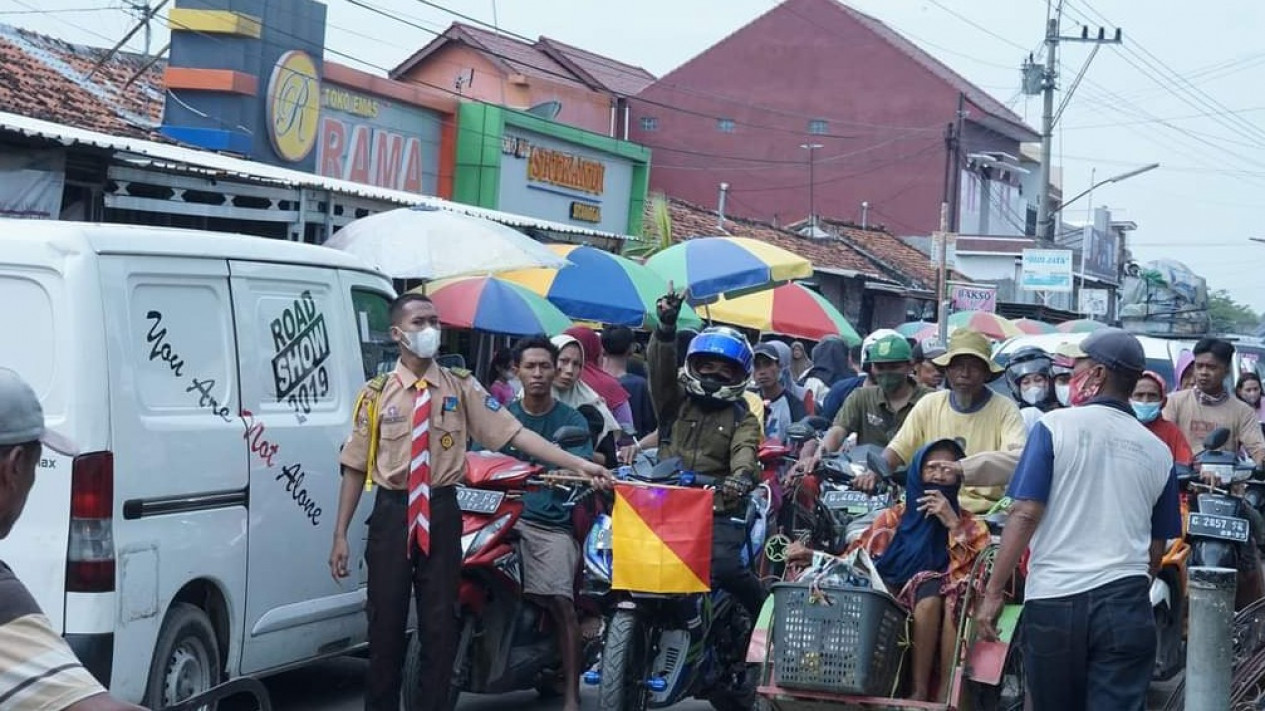Untuk membantu kelancaran arus lalu lintas hanya nampak  beberapa anggota Pramuka yang nampak sibuk secara bergantian mengatur arus lalu lintas di perempatan Pasar Sitanggal ini sejak pagi hari, lalu lalang pengunjung pasar yang membuat kendaraan tidak bisa leluasa bergerak. (oso/act)