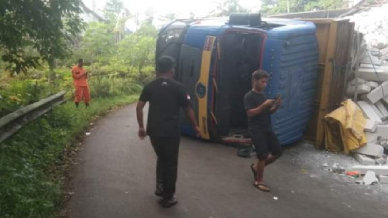 Truk Angkut Bata Ringan Terguling di Jalan Menurun Purbalingga