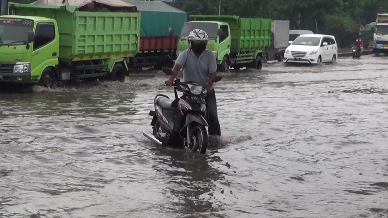Karena terjebak dalam genangan banjir yang cukup dalam, sejumlah kendaraan roda dua mati mesinnya dan pengendaranya harus mendorong motornya yang mogok.