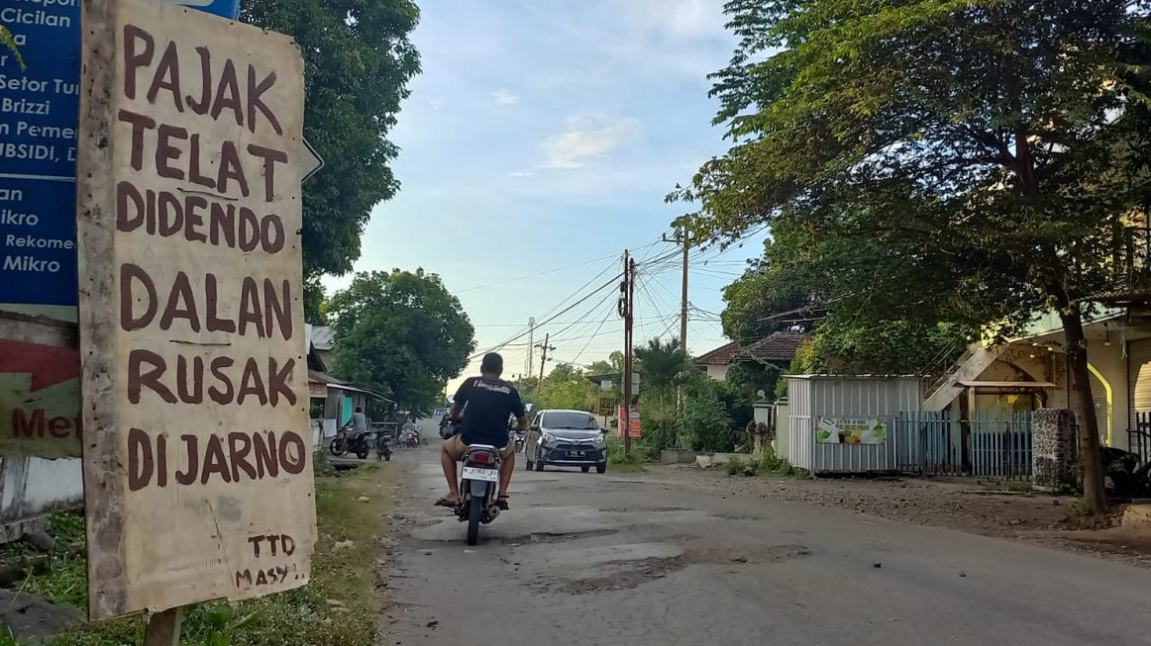 Padahal jalan tersebut, merupakan akses utama atau jalur tengah yang padat aktivitas kendaraan. Dalam papan triplek itu bertuliskan: Pajak Telat Didendo, Dalan Rusak Dijarno. Ttd Masy.