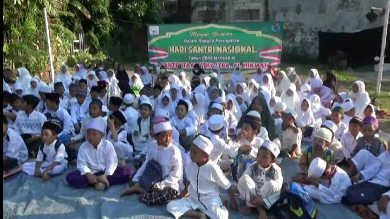 Surabaya, tvOnenews.com - Memperingati Hari Santri Nasional, ratusan santri anak-anak hingga dewasa dari TPA Masjid Al Hikmah Surabaya, menggelar ngaji bareng di lapangan terbuka. Selain itu, mereka juga dikenalkan sejarah Hari Santri, yang tidak lepas dari perjuangan kemerdekaan Republik Indonesia.