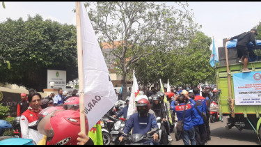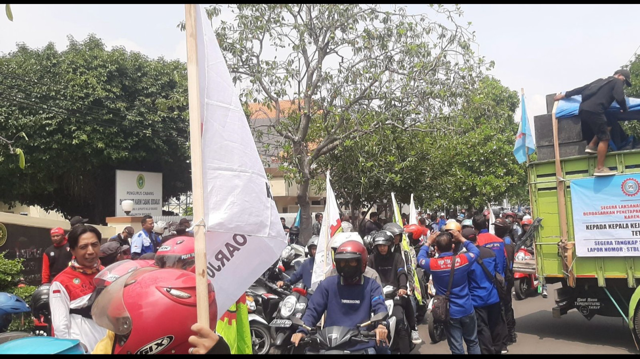 Sidoarjo, tvOnenews.com - Ratusan buruh yang tergabung dalam Serikat Pekerja Seluruh Indonesia (SPSI) se Sidoarjo melakukan aksi unjuk rasa di depan Pengadilan Negeri (PN) Sidoarjo. Mereka meminta PN untuk segera menyelesaikan sengketa atas tanah PT Kejayan Mas.