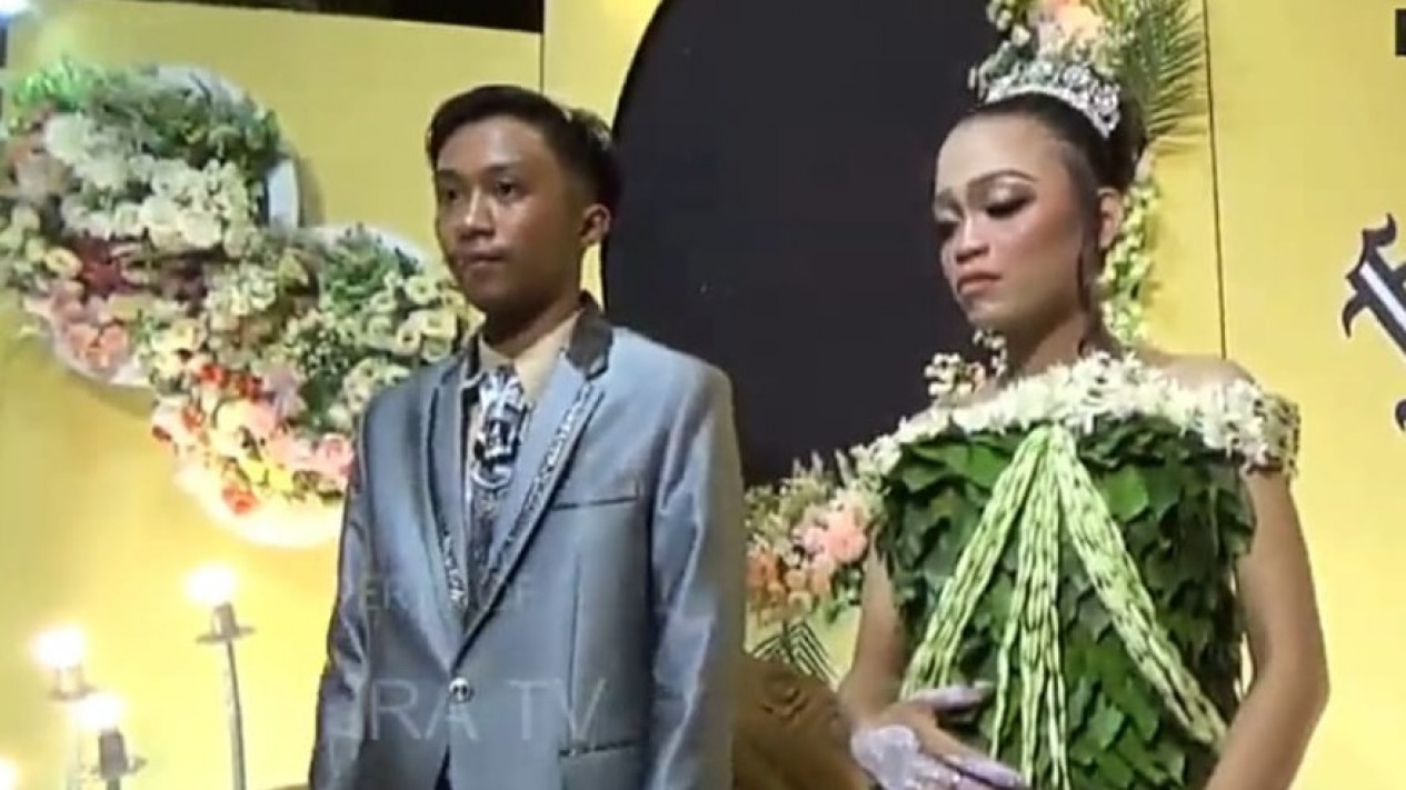 Dalam video berdurasi 15 detik itu, nampak salah satu seorang pengantin perempuan, mengenakan gaun pengantin dari daun.