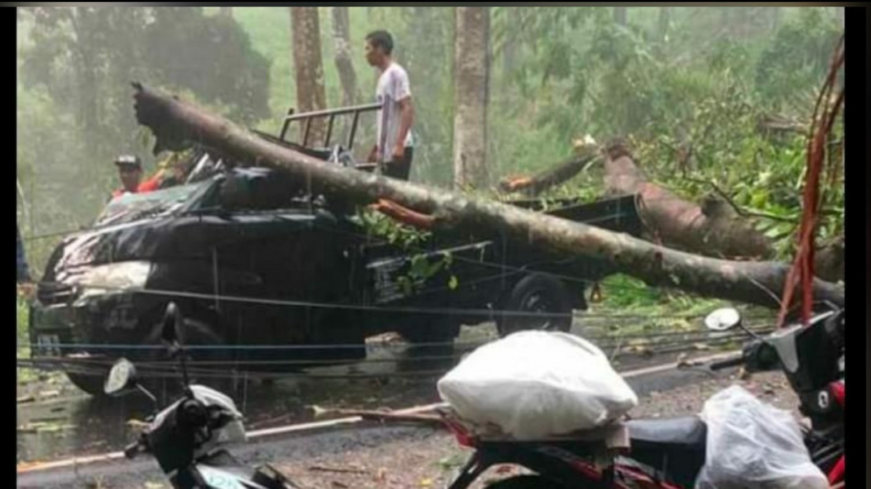 Tidak hanya sepeda motor dan pengendaranya yang menjadi korban tertimpa pohon tumbang. Namun pengendara mobil pick up jenis Grandmax nomor polisi W-8726-XZ, sopirnya juga menjadi korban.