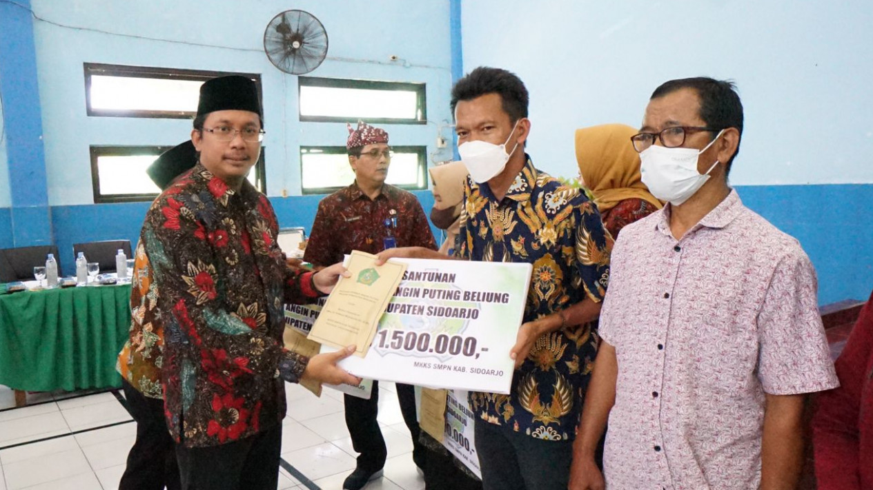 Sidoarjo, Jawa Timur - Puluhan guru siswa SMP Negeri se Kabupaten Sidoarjo yang menjadi korban bencana angin puting beliung, mendapatkan bantuan dari MKKS (Musyawarah Kerja Kepala Sekolah) SMP Negeri Sidoarjo. Secara simbolis bantuan itu diserahkan langsung oleh Bupati Sidoarjo, Ahmad Muhdlor Ali di Aula SMPN 2 Sidoarjo.