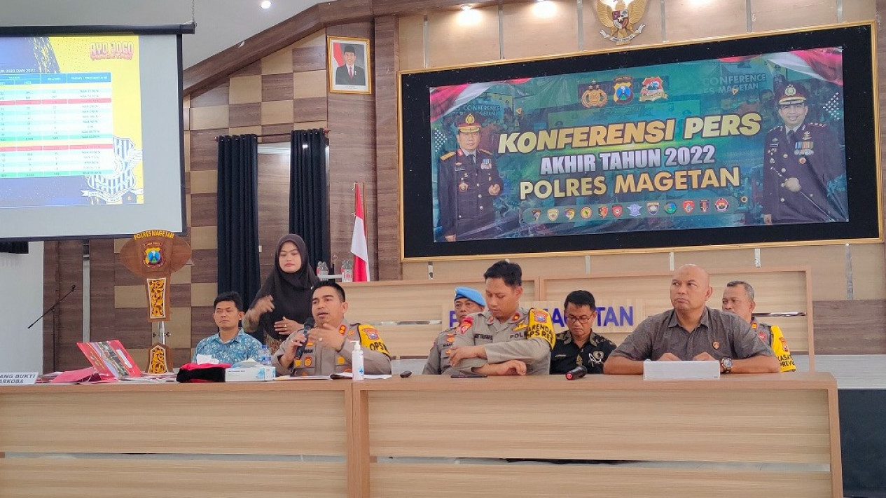 “Untuk laka menonjol di wilayah hukum Polres Magetan sebanyak 826 kejadian naik 52 persen dibanding tahun 2021 yang hanya 434 kejadian,” ujar Ridwan saat memimpin press release akhir tahun di Mapolres Magetan, Jumat (30/12).
