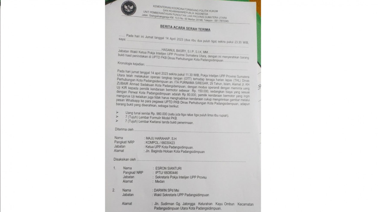Berdasarkan, kronologis pada hari Jum'at tanggal 14 April 2023, sekira pukul 11.30 WIB, Pokja Intelijen UPP Provinsi Sumatera Utara telah melakukan operasi tangkap tangan (OTT) terhadap Pegawai Negeri Sipil (PNS) dan tenaga harian lepas (THL) Dinas Perhubungan Kota Padang Sidempuan an. IPS (29), dengan modus operandi meminta uang Uji KIR kepada pemilik kendaraan bermotor sebesar Rp. 150.000.
