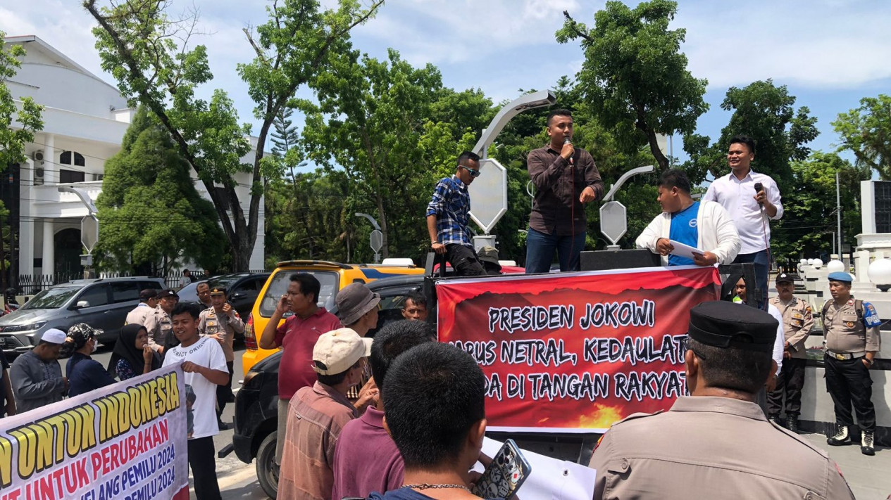 "Yang pertama kita ingin mendorong Presiden RI Jokowi agar tidak cawe-cawe dalam hal pelaksanaan Pilpres," kata Roni Alhadi selaku koordinator aksi.