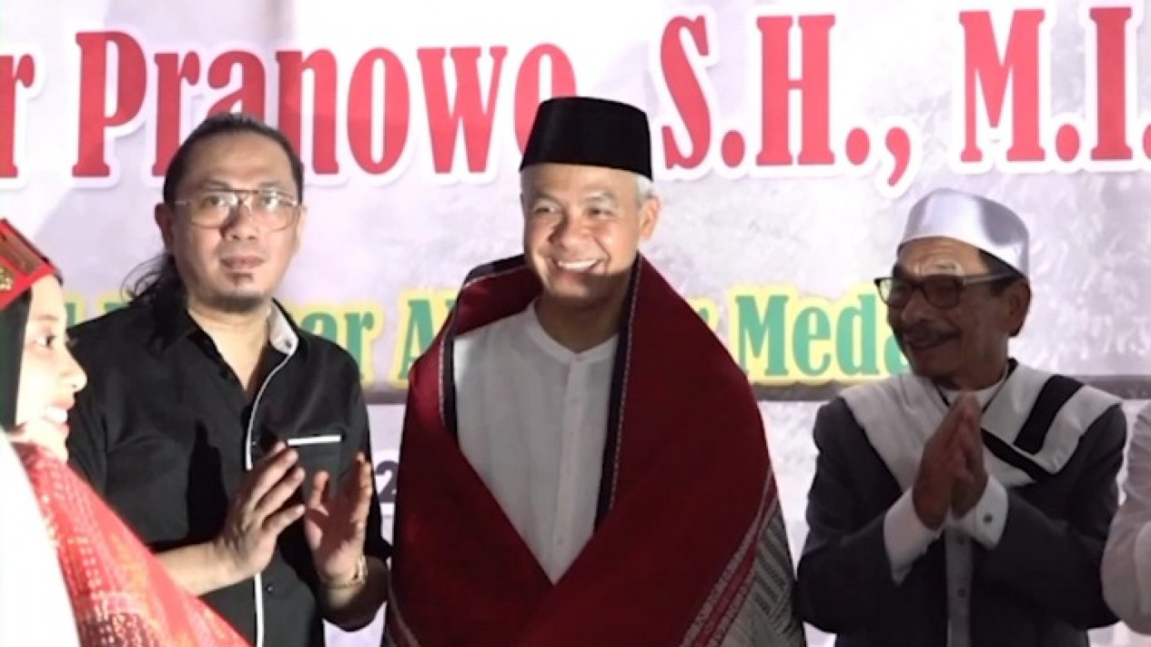 Di bibir panggung, Ganjar sudah disambut barisan santri yang mengenakan pakaian adat Batak Toba. Lalu Ganjar dipakaikan kain Raja Ulos Batak dan diajak menari tor-tor bersama.