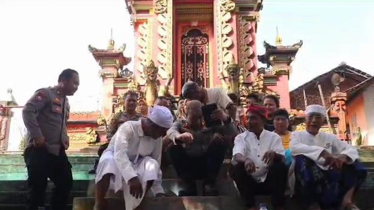 Aparat kepolisian bersama masyarakat dan umat Hindu bahu membahu membersihkan lingkungan pura dengan cara menyapu, membabat dan mencabuti rumput.