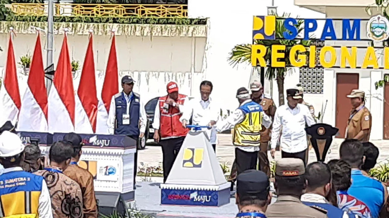 Binjai, tvOnenews.com - Presiden Joko Widodo meresmikan Jaringan Distribusi Utama Saluran Penyedia Air Minum (JDU SPAM) regional Medan Binjai dan Deli Serdang (Mebidang) yang berada di Kelurahan Tanah Merah Kecamatan Binjai Selatan Kota Binjai, yang menelan anggaran sekitar Rp 948 Miliar, Jumat (25/8/2023).
