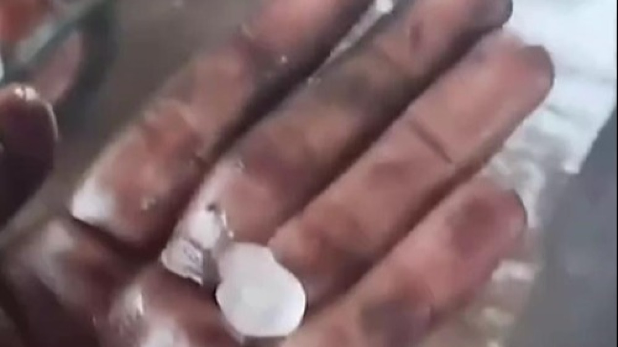 Tampak dua orang di dalam video mengumpulkan butiran es yang turun bersama hujan sambil menunjukkan ke kamera fenomena yang terjadi.