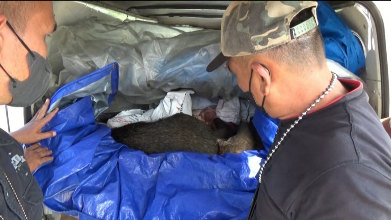 Setelah melakukan pengejaran, petugas pun menemukan mobil minibus berwarna putih sedang terparkir di areal terminal ASDP Bakauheni. Petugas melakukan pemeriksaan muatan kendaraan dan mendapati ratusan kilogram daging celeng.