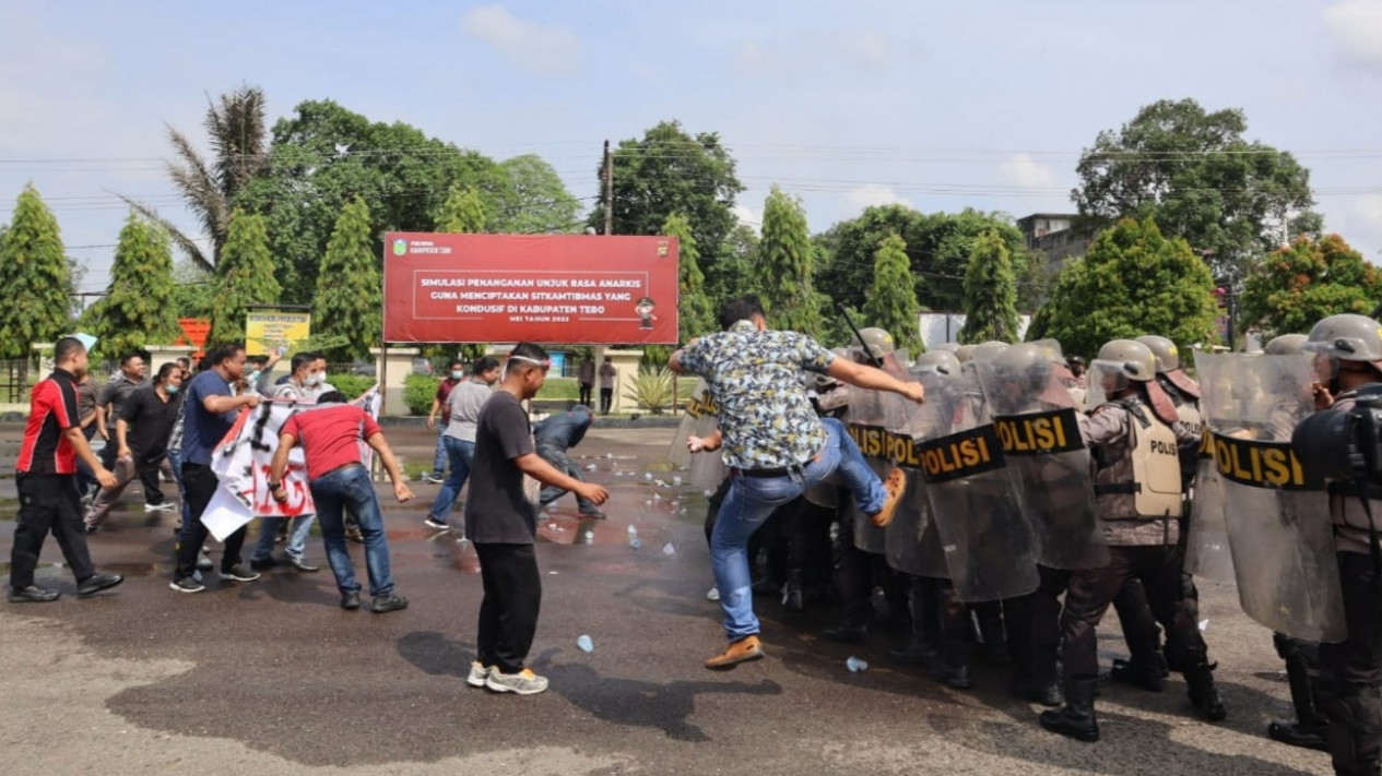 Bentrok mahasiswa dan polisi ini merupakan simulasi Penanganan Unjuk Rasa yang Anarkis guna menciptakan Sitkamtibmas yang kondusif di Kabupaten Tebo, Jumat (27/5/2022) di Lapangan Apel Mapolres Tebo.